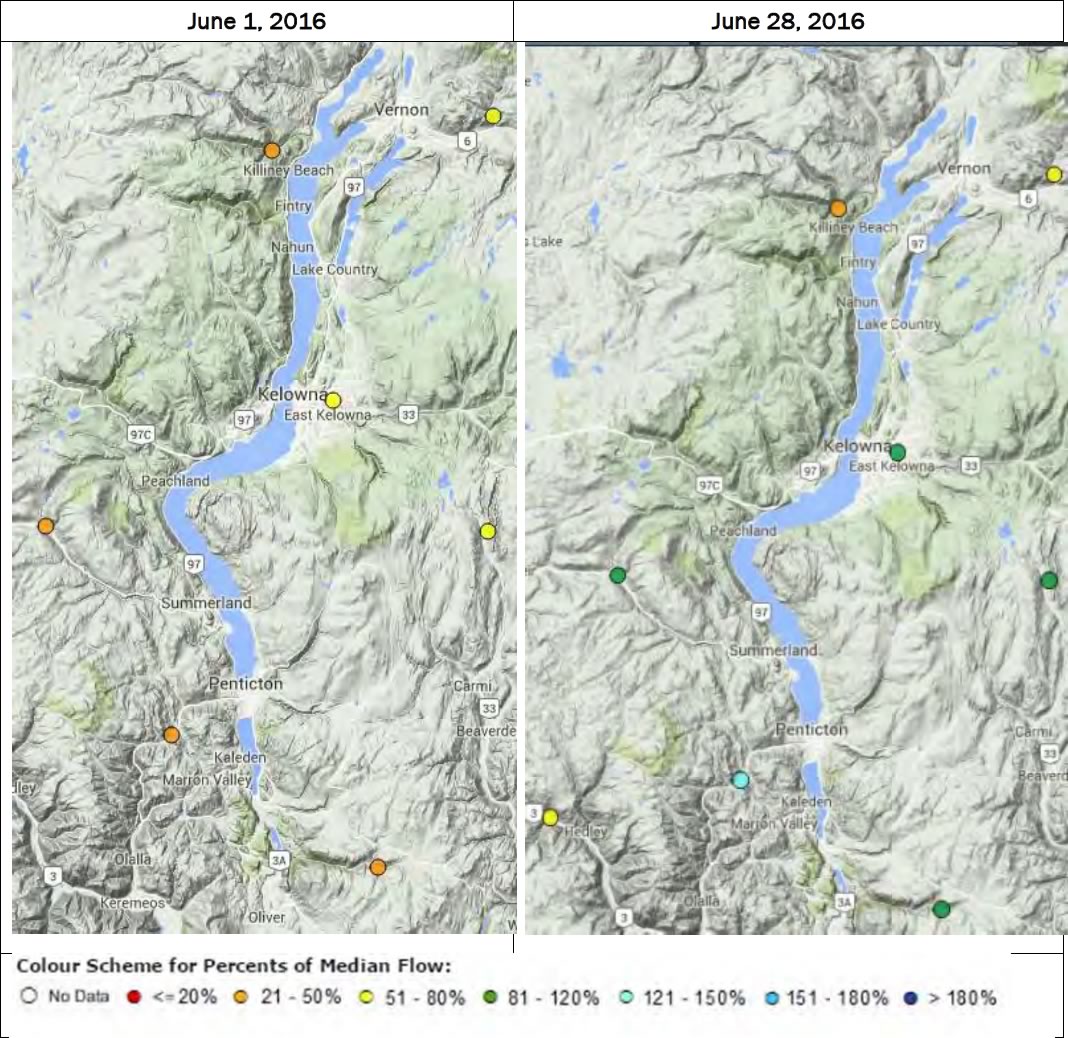 Some streams in the Okanagan that were flowing below average last month (and last week!) are recovered this week, due to the June rains and where they fall, but levels change rapidly. Stream conditions are a major factor in the declared drought condition.