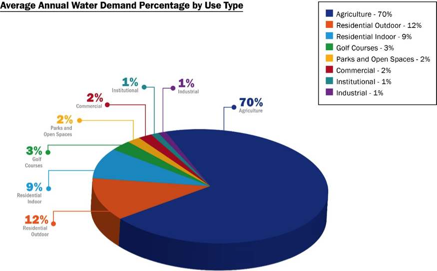 The research also shows which sectors use what amount of water, and when. The greatest amount of water is used April to October, due to crop irrigation. While water use by some sectors remains stable throughout the year (e.g. commercial), other sectors use more mid-spring to mid-fall to meet outdoor watering needs (e.g. golf courses, parks, and agriculture).